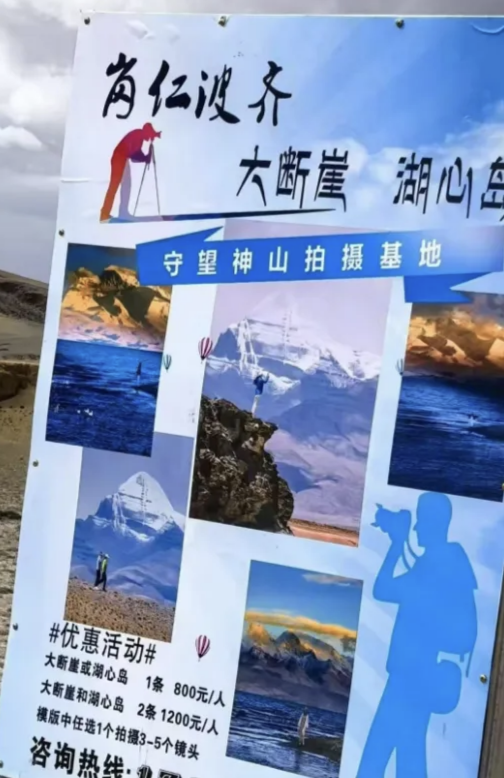 相关图片显示,公示牌上注明有“优惠活动”,拍摄大断崖或湖心岛1条收费800元/人,2条收费1200元/人。公示牌上有一些拍摄的照片案例,并附有咨询电话。有网友评论称:“文旅不管管么?”